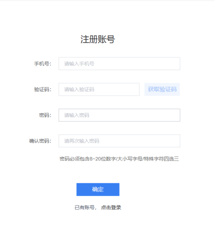 4.输入手机号、验证码,设置密码,点击“确定”。(密码必须包含英文字母大写、英文字母小写、阿拉伯数字、符号4种字符其中3种)