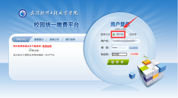 1.登录武汉软件工程职业学院校园统一缴费平台,选择“用户名”,用户名为考生身份证号,密码为身份证号后六位。