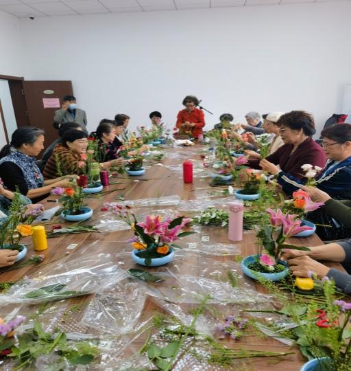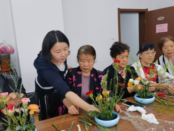 来自武汉软件工程职业学院(武汉开放大学)艺术与传媒学院的张晓云老师主持《花艺雅韵》插花沙龙,让秋日焕发出春的生机。老年大学为大家准备了花瓣如缎的百合,绚丽奔放的多头玫瑰,色彩丰富、品种多样的花卉,大家巧手修剪枝叶,搭配色彩,将一朵朵百合、玫瑰、康乃馨与绿植错落有致地插入花器。张晓云耐心讲解花材寓意与构图技巧,鼓励大家以花表达心境。顷刻间,一个个独具匠心的花作跃然眼前,大家手捧作品笑意盈盈。